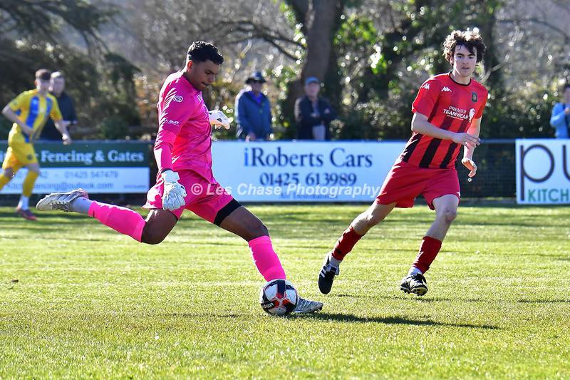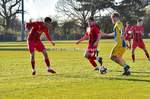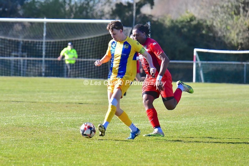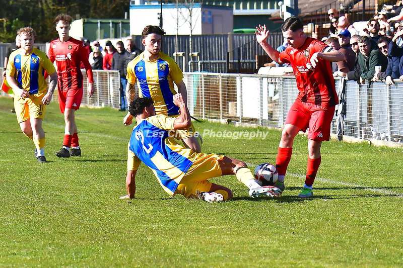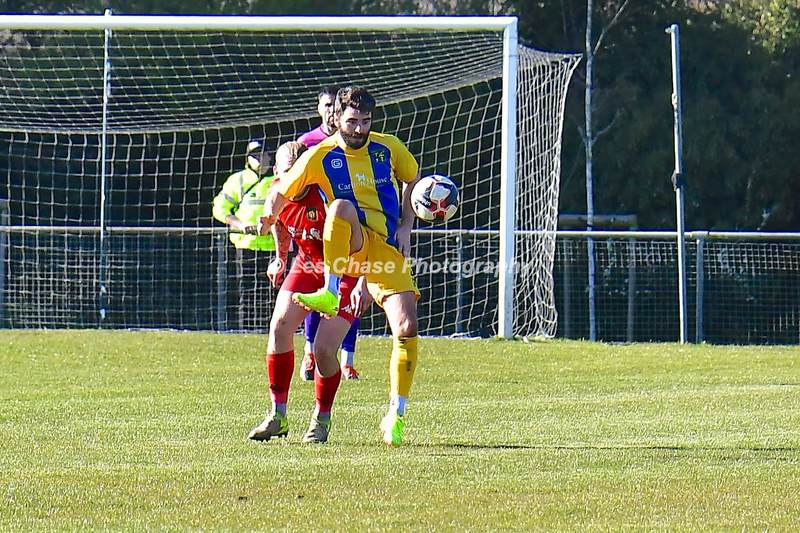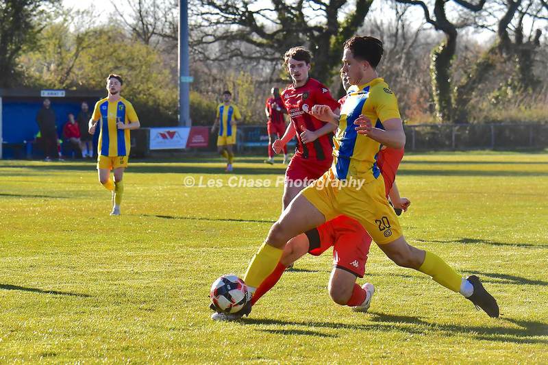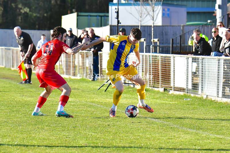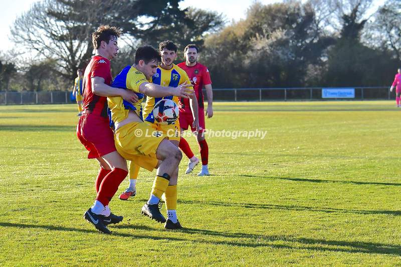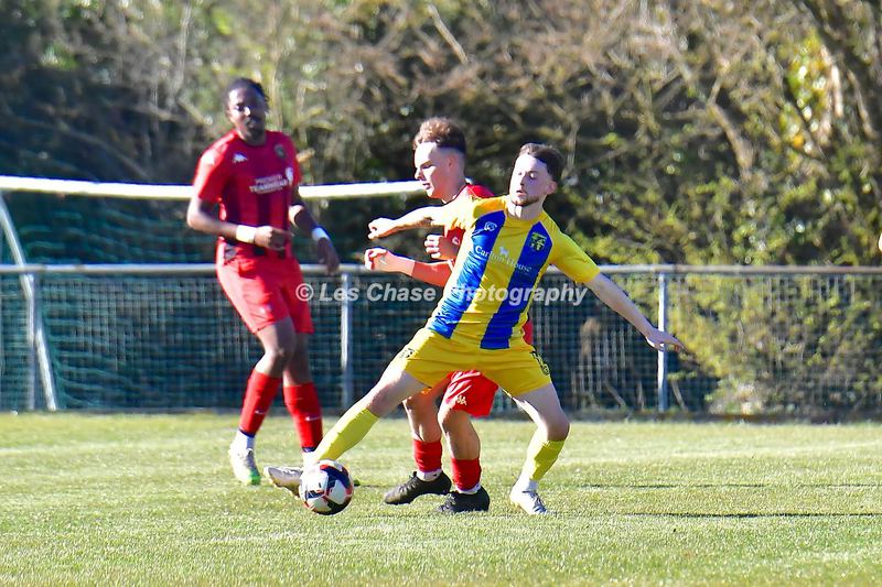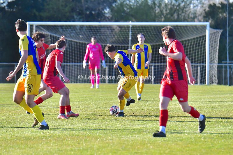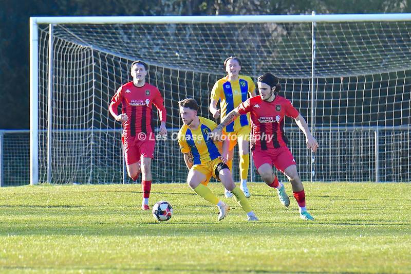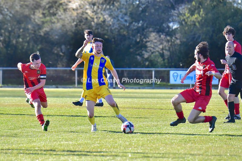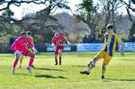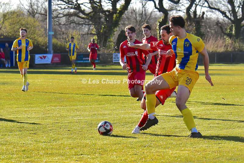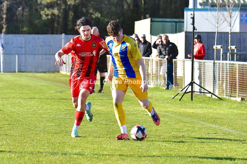 New Milton vs Petersfield Town Wessex Premier Division 28/02/2026. New Milton in Yellow Blue Tops. Score is a 1-1 Draw